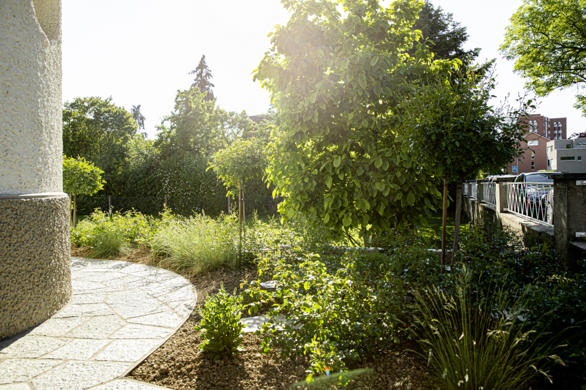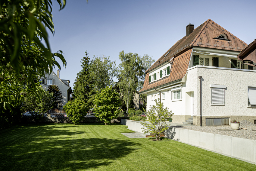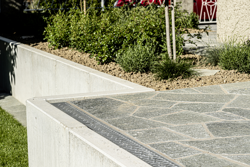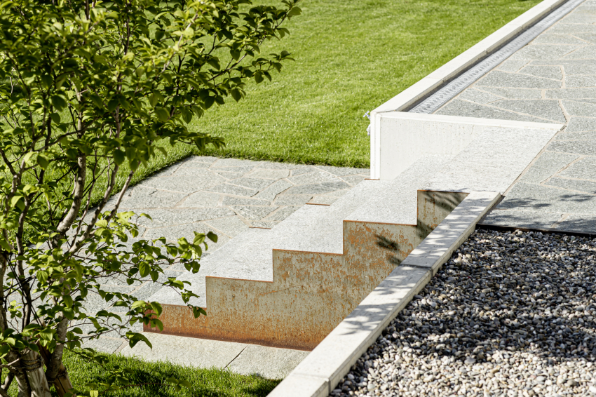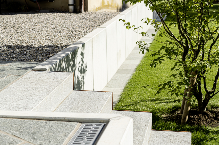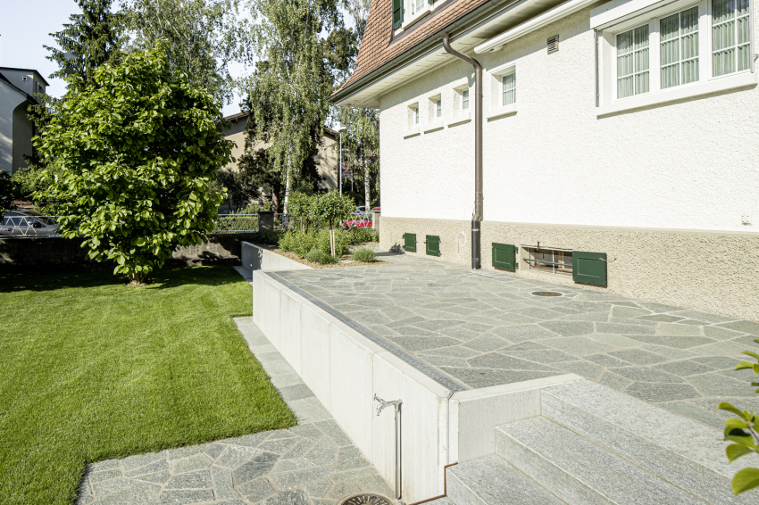 Die Notwendigkeit einer Sanierung wurde hier als Chance genutzt, mehr Terrassenfläche zu generieren, durch eine neue Linienführung eine harmonischere Verbindung von Haus und Garten herzustellen und im Ganzen ein bedeutend moderneres Bild zu präsentieren. Die marode Stützmauer haben wir durch eine moderne Winkelplattenmauer ersetzt, die neue Belagsfläche wurde entsprechend der Architektur des Hauses gewählt und in Handarbeit angepasst und verlegt, die Stahlwange der Blockstufentreppe ist eine gelaserte Spezialanfertigung.