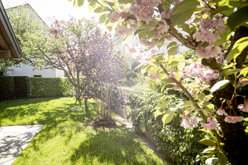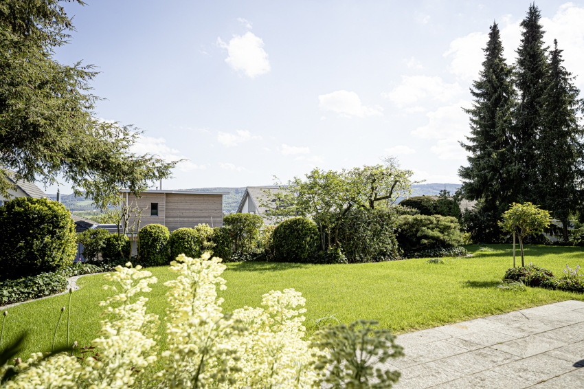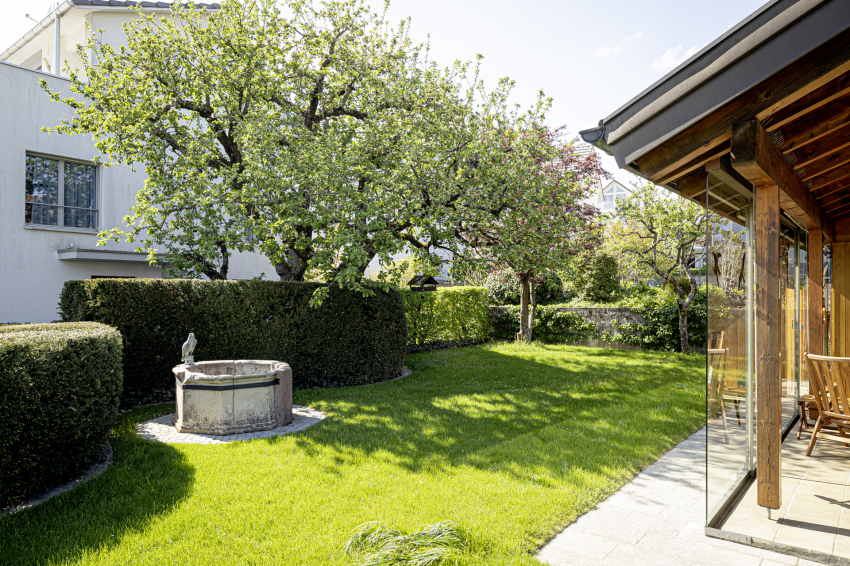 Diese stilvolle Gartenanlage im Herzen von Oberwil erfordert ihrer vielen Finessen wegen dauerhafte Pflege. Während der Fokus in der Erhaltung der Identität und Struktur des Gartens liegt, setzen punktuelle pflanzliche Veränderungen Akzente. Dem Anspruch der Kundschaft werden wir durch Präzision — wichtig etwa im Bundsteinbereich zwischen Hecke und Rasen — und Detailtreue gerecht. Besondere Freude bietet hier der Apfelbaum, der als vergleichsweise wilder Gast für einen originellen Kontrast in der Gesamterscheinung sorgt.
