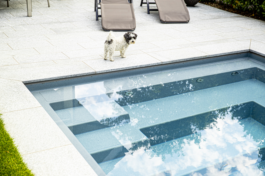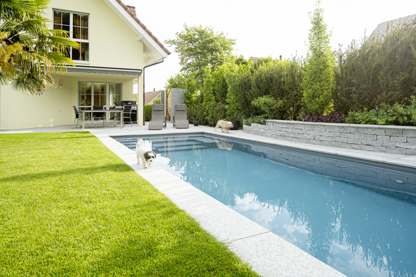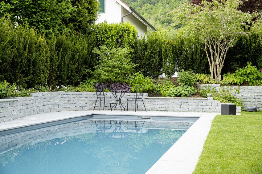 Die ursprüngliche Gartenanlage wurde saniert und um einen Swimmingpool erweitert. Dafür haben wir unter anderem das Gelände begradigt. Während einzelne Pflanzenbestände wie die Palmengruppe in die harmonische Neukonzeption einbezogen worden sind, wurde die Gelände- und Poolbegrenzung mit Natursteinmauern neu definiert. Die in Handarbeit erstellten Mauern doppeln an mehreren Stellen als Sitzflächen; ihre geschwungenen Linien schaffen Leichtigkeit und Raum. Für die Belagsflächen ist Naturstein zum Einsatz gekommen; eine Herausforderung war, die organischen Formen der Mauern mit den Platten zu übernehmen.