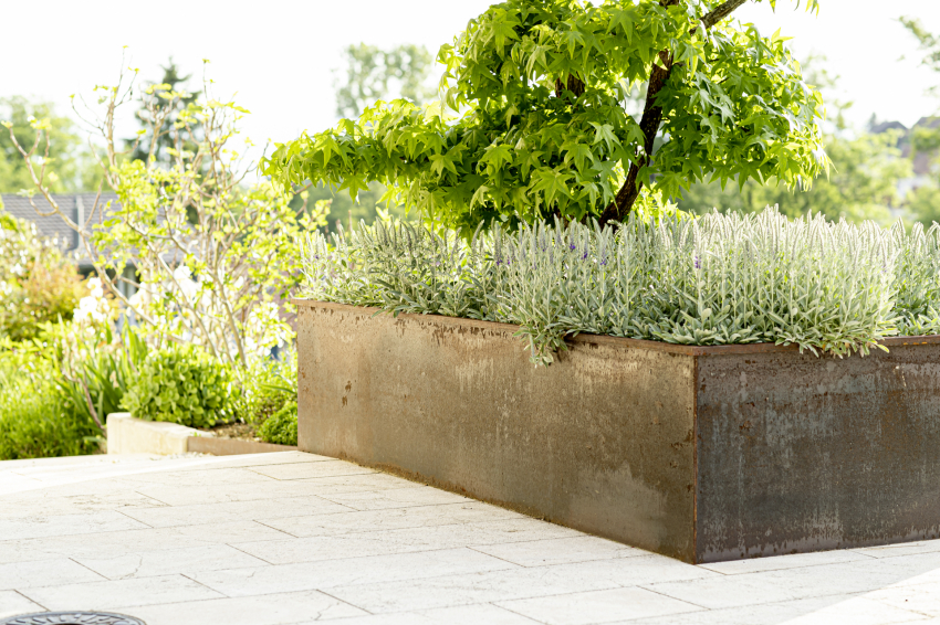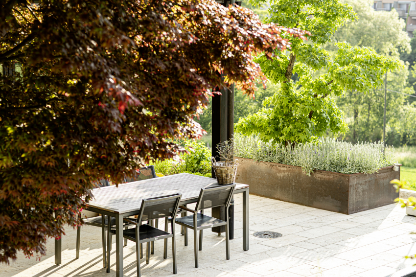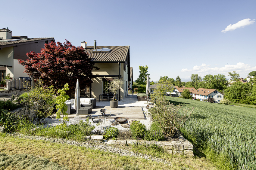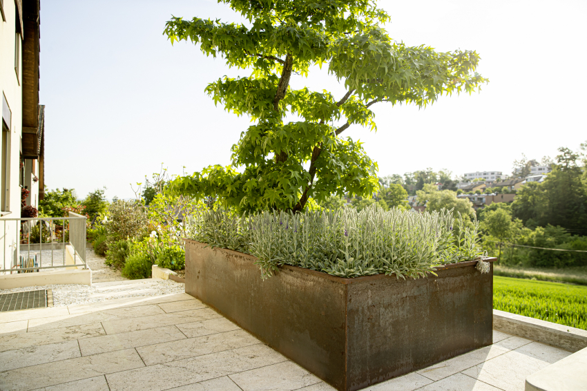 In enger Zusammenarbeit mit dem Kunden wurde dieser Garten in mediterranen Stil konzipiert und realisiert. Es galt, auf einer begrenzten Fläche verschiedene Elemente unter- und in Einklang zu bringen. Definierende Bestandteile sind die Jurakalkstein-Platten und das eigens angefertigte Stahlbeet im Essbereich, das Holzdeck mit dem Olivenbaum und der knirschende Kies, der als verbindendes und erweiterndes Element zum Einsatz kommt. Ein Entwässerungsstreifen am Rand des Grundstücks verhindert, dass vom benachbarten Feld unerwünschtes Wasser auf das Gelände gelangt.